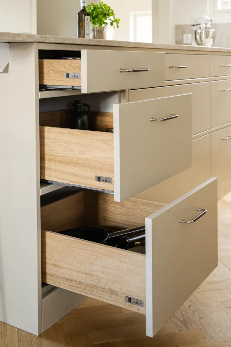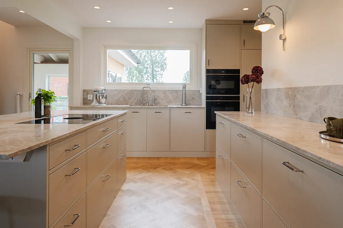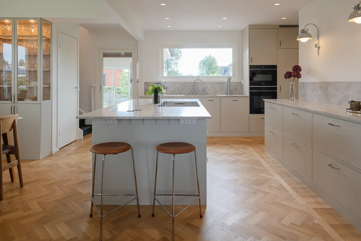 Ett traditionellt kök där klassisk Shaker-design och vackra detaljer skapar en tidlös och inbjudande atmosfär. Den generösa köksön med spishäll blir en naturlig samlingspunkt, medan det vackra fiskbensparkettgolvet och det rikliga ljusinsläppet från fönstren förstärker den varma och hemtrevliga känslan. Bänkskivan i kvartsit ger en exklusiv och hållbar arbetsyta.