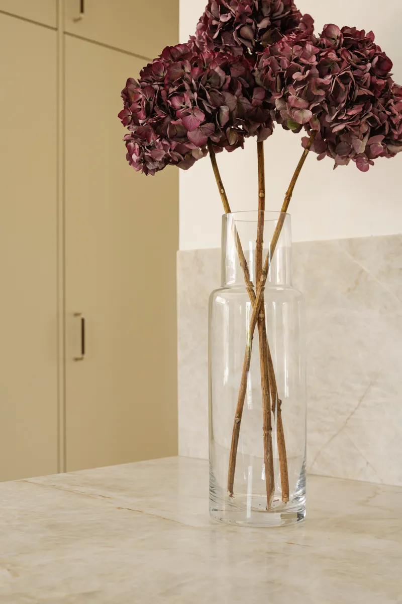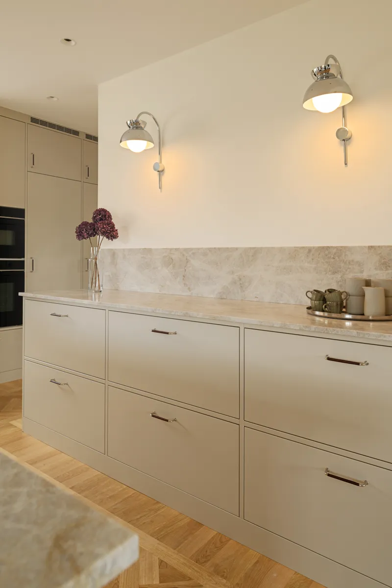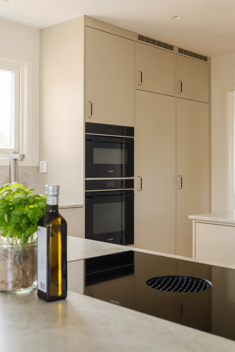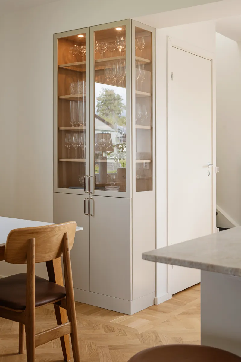 Ett traditionellt kök där klassisk Shaker-design och vackra detaljer skapar en tidlös och inbjudande atmosfär. Den generösa köksön med spishäll blir en naturlig samlingspunkt, medan det vackra fiskbensparkettgolvet och det rikliga ljusinsläppet från fönstren förstärker den varma och hemtrevliga känslan. Bänkskivan i kvartsit ger en exklusiv och hållbar arbetsyta.