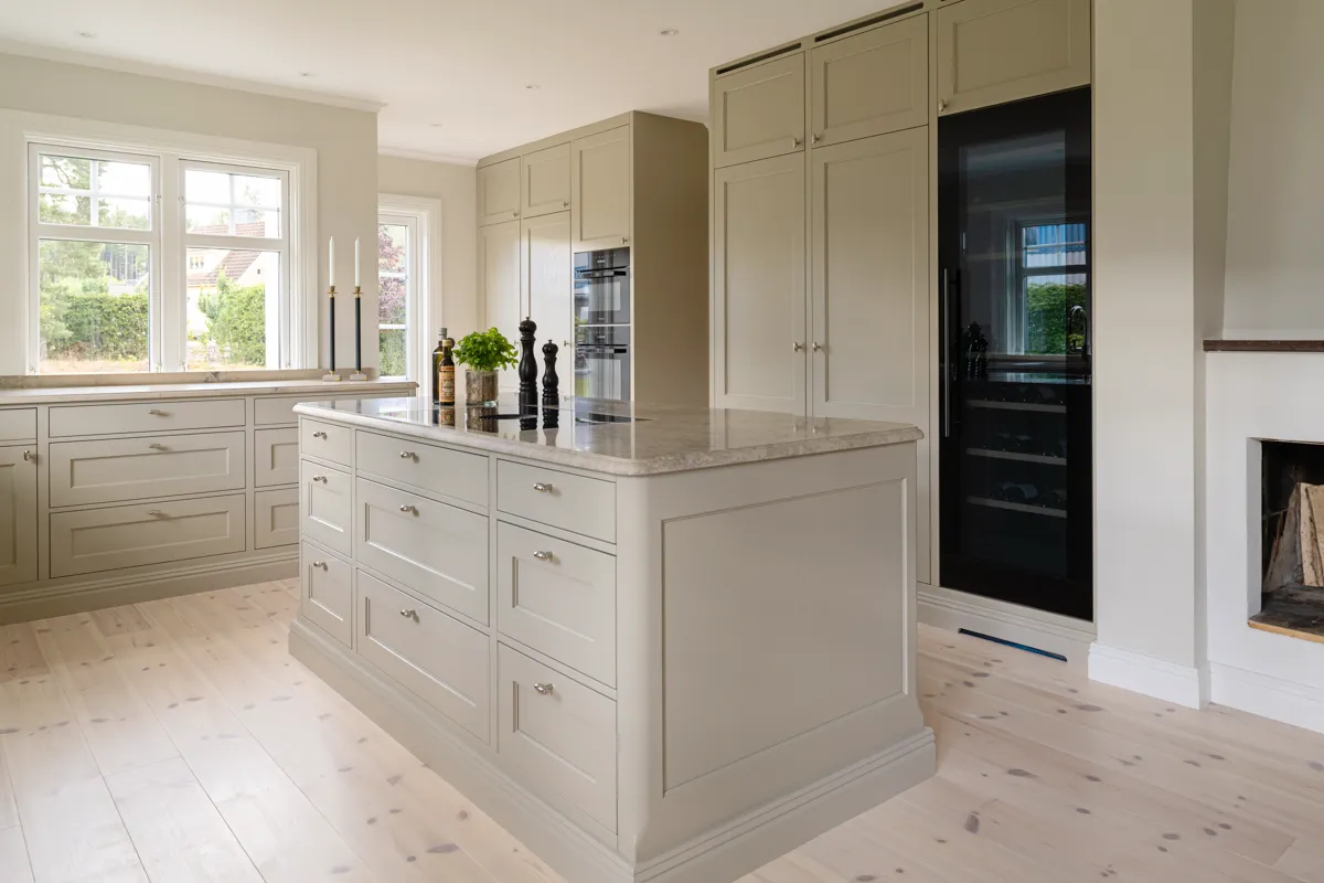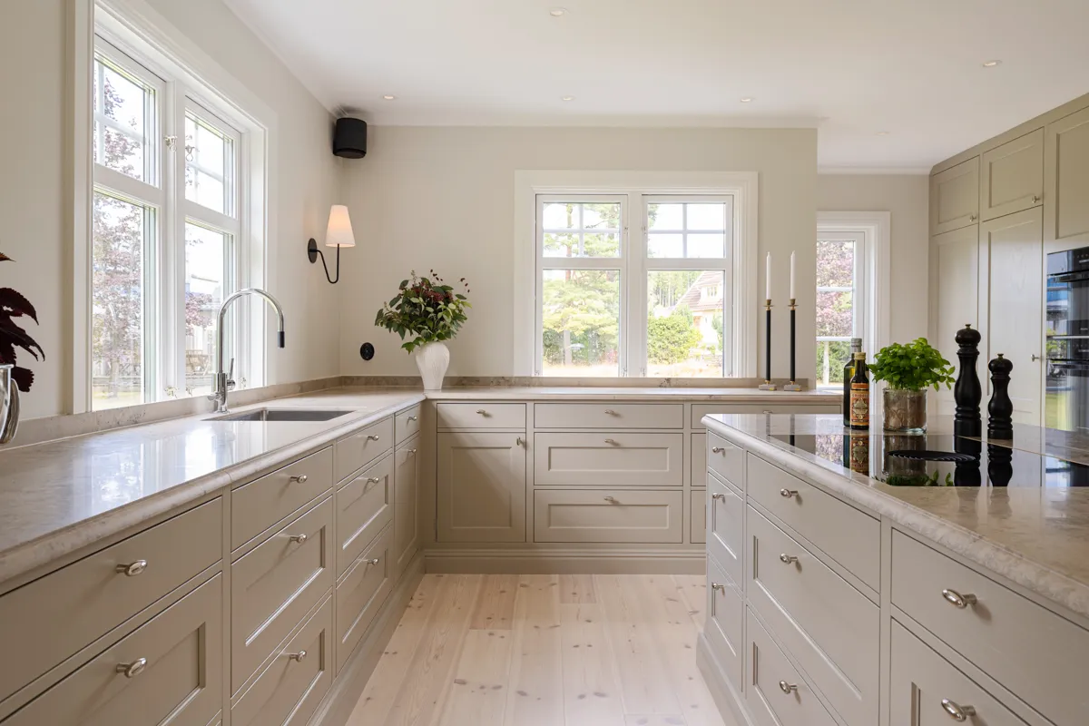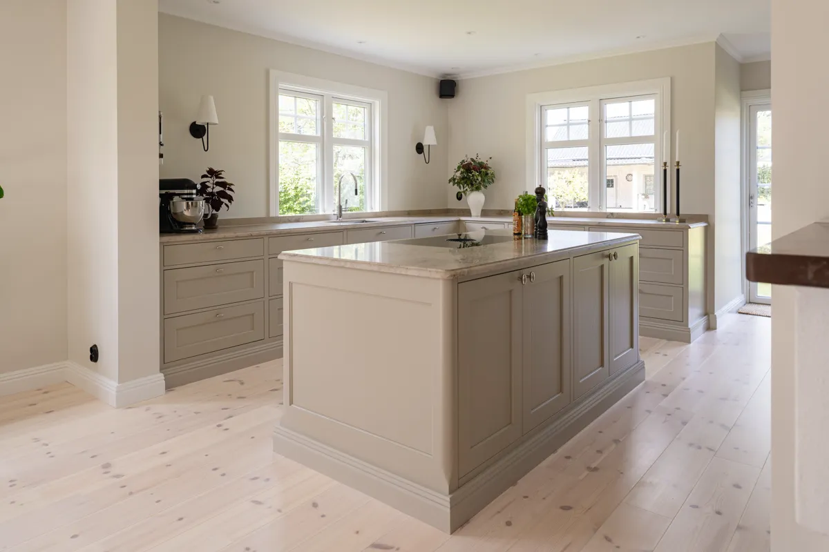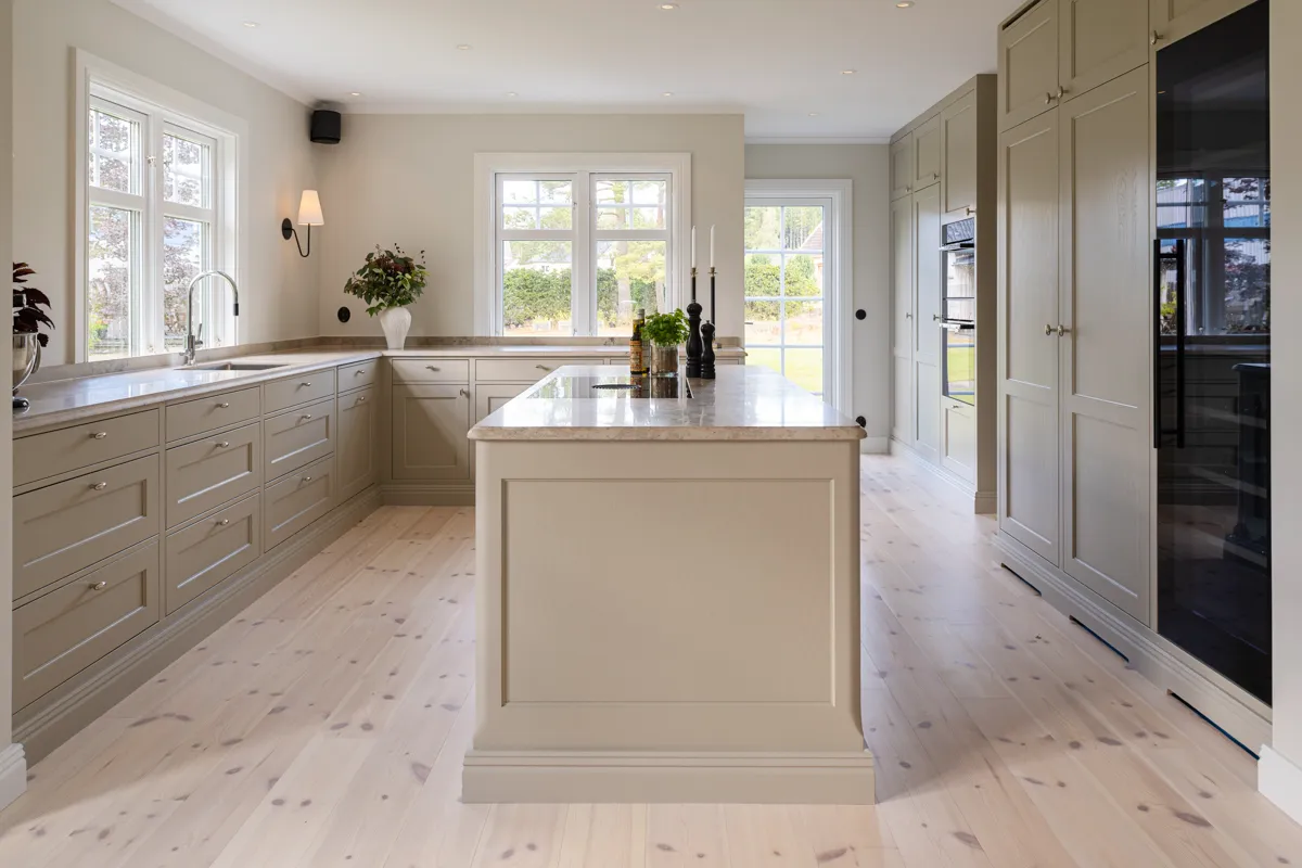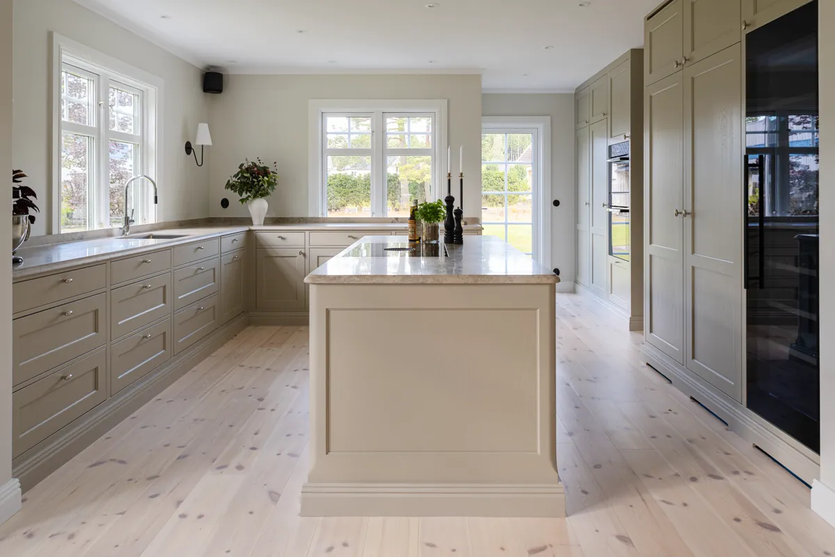 Text: Upplev ett traditionellt kök där klassisk Shaker-design möter naturliga material som ask och kalksten. De stora fönstren fyller rummet med ljus och skapar en luftig och inbjudande atmosfär. Den vackra köksön blir en naturlig samlingspunkt för familj och vänner i detta tidlösa och vackra kök.