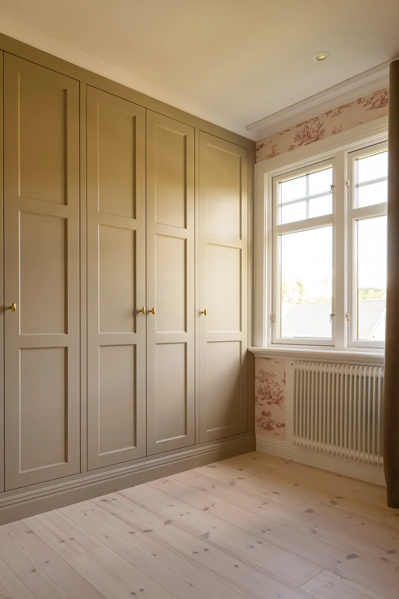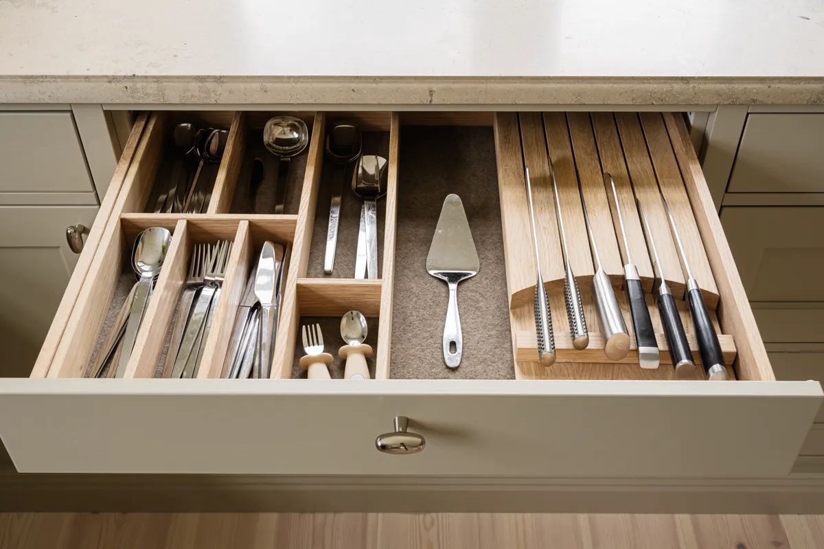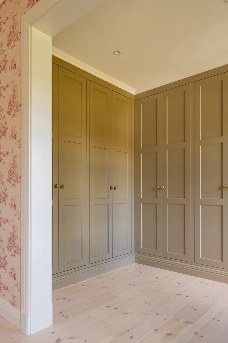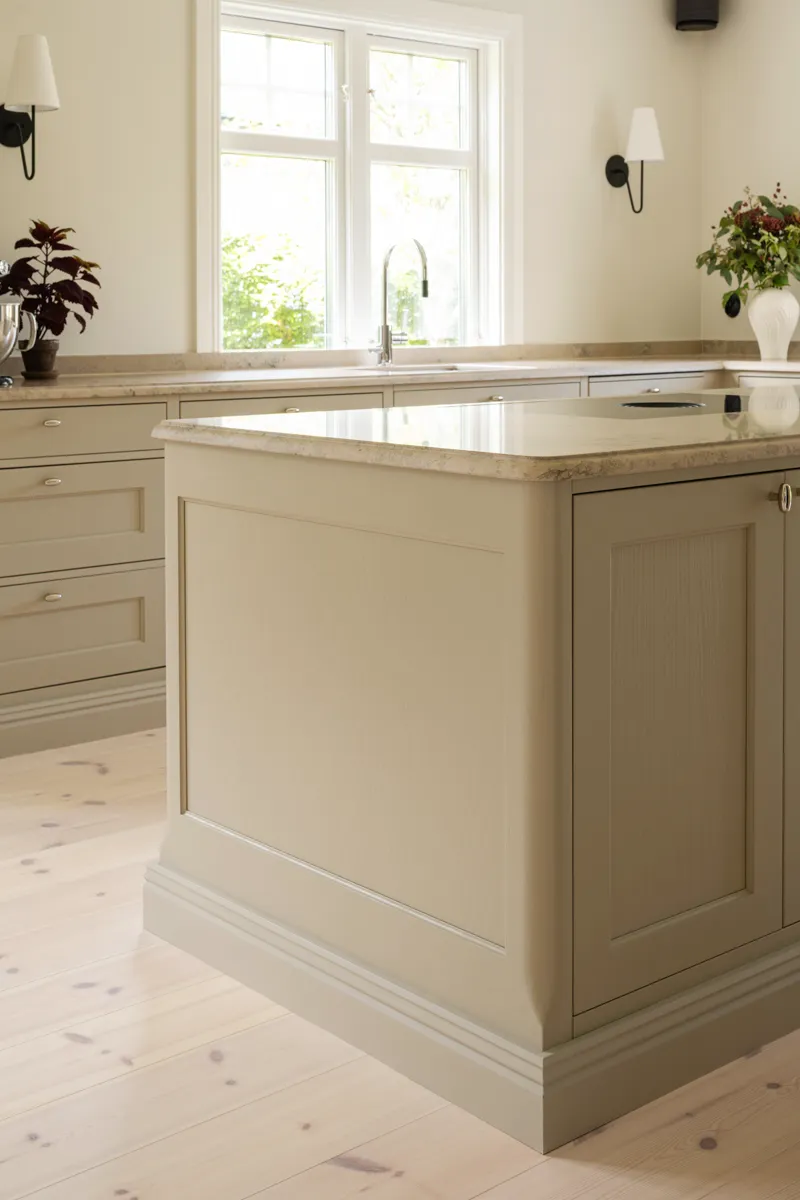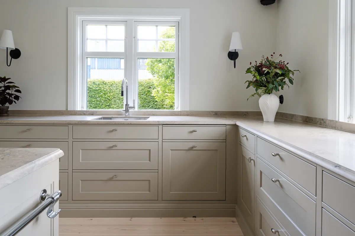 Text: Upplev ett traditionellt kök där klassisk Shaker-design möter naturliga material som ask och kalksten. De stora fönstren fyller rummet med ljus och skapar en luftig och inbjudande atmosfär. Den vackra köksön blir en naturlig samlingspunkt för familj och vänner i detta tidlösa och vackra kök.